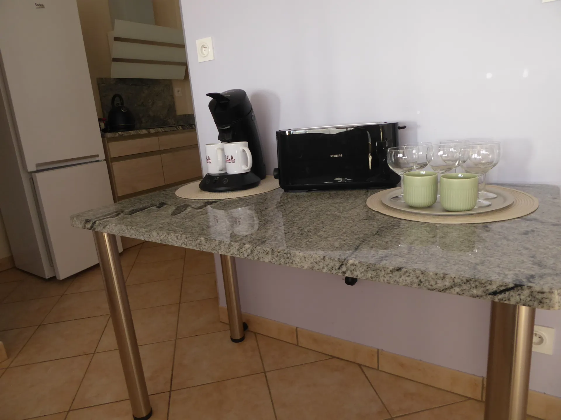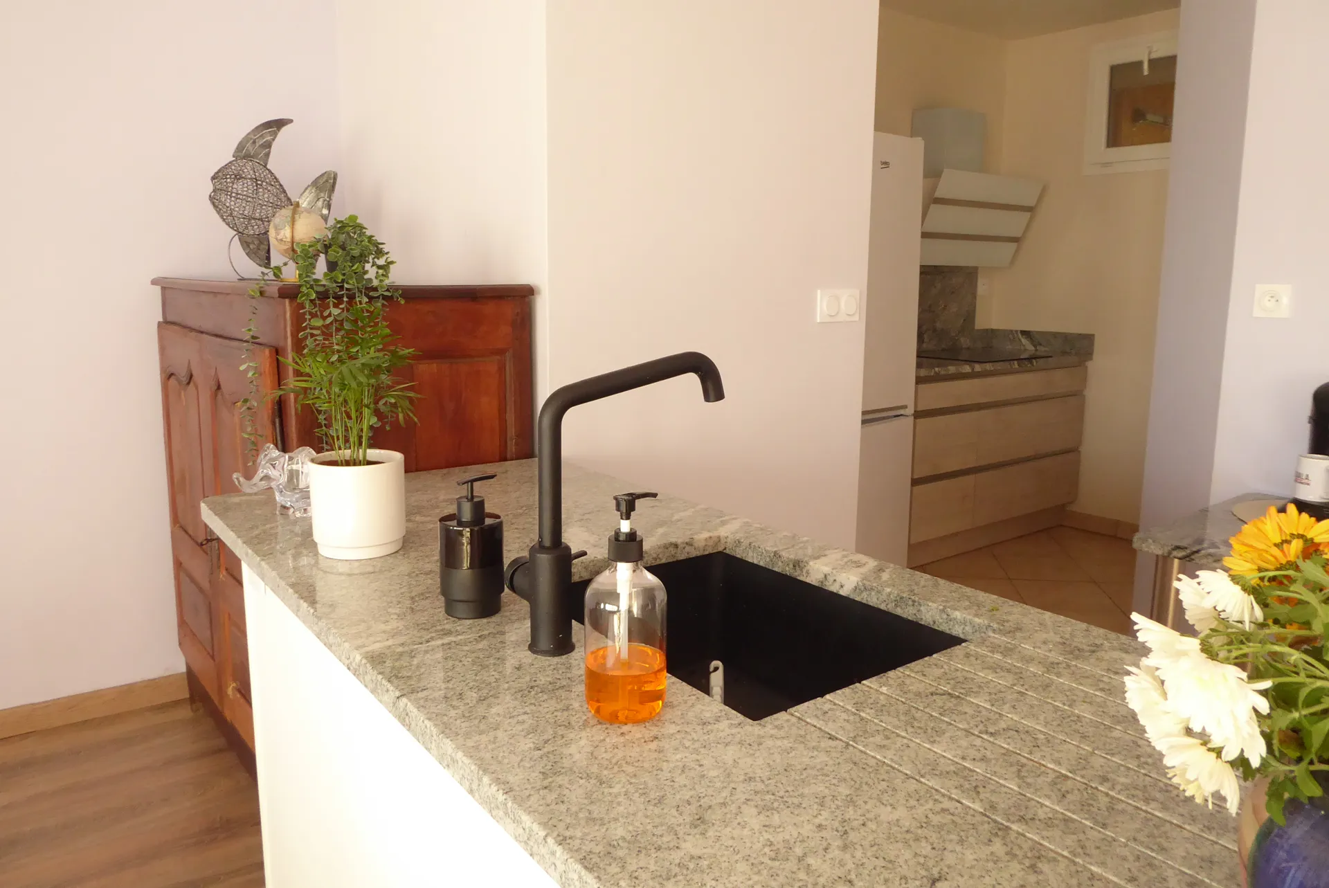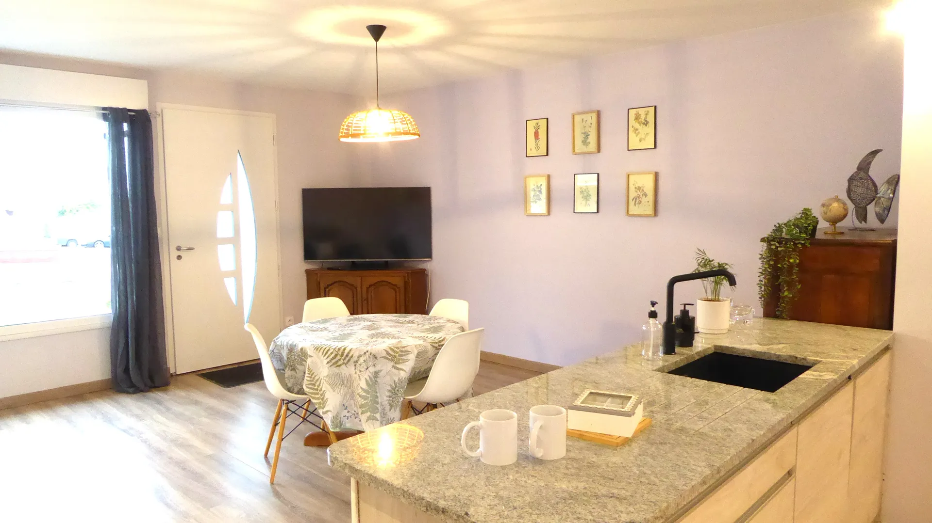 L’appartement dispose d’une grande pièce de vie lumineuse, vue sur une place et un espace vert grâce à une grand fenêtre panoramique. Vous y trouverez un canapé confortable et convertible (literie de bonne qualité) une TV et un espace de travail parfait pour le télétravail ou les séjours professionnels ????. La cuisine ouverte, moderne et entièrement équipée (cafetière, bouilloire, grille-pain…) dispose d’un plan de travail en granit qui ajoute une touche élégante.