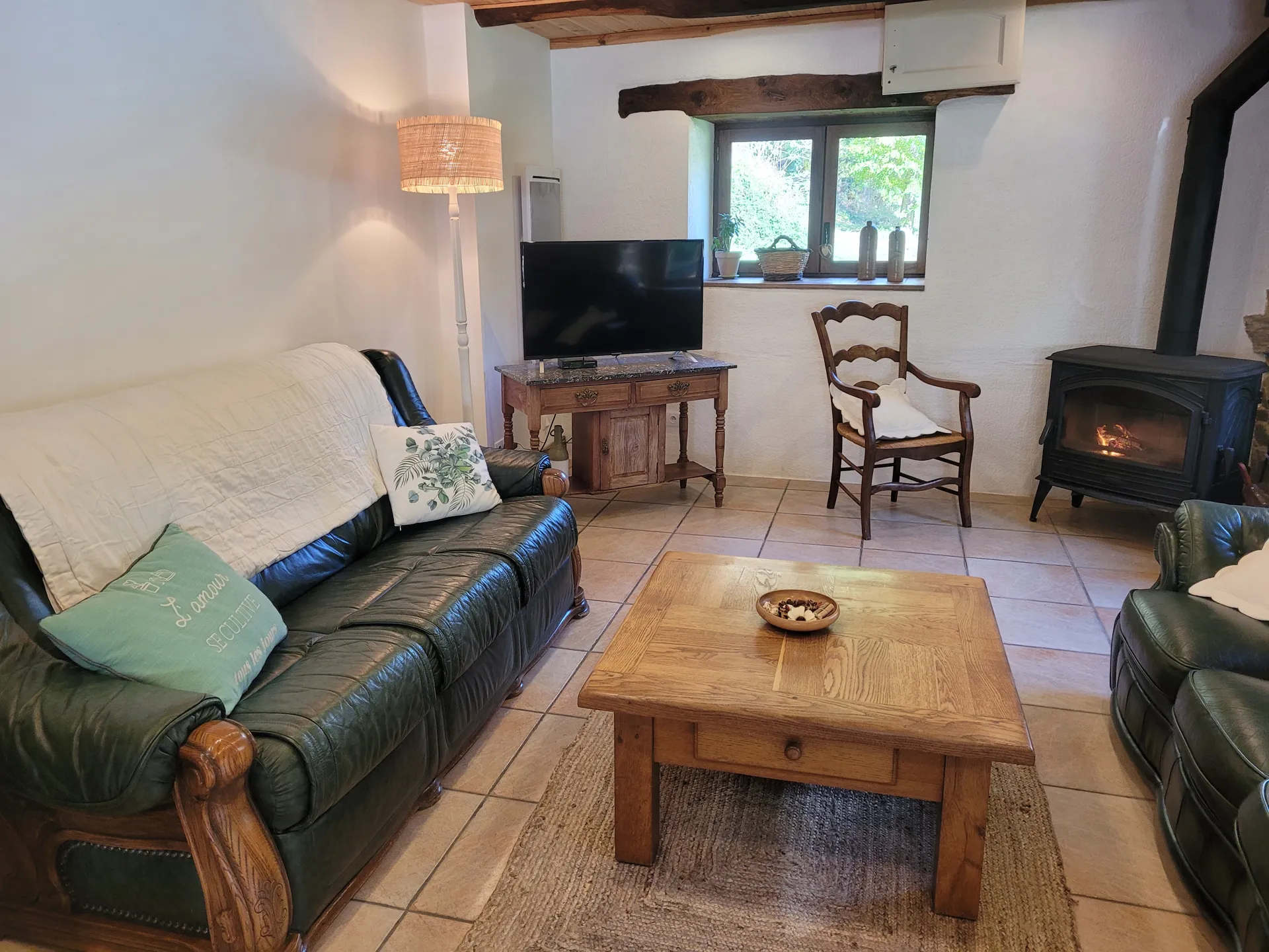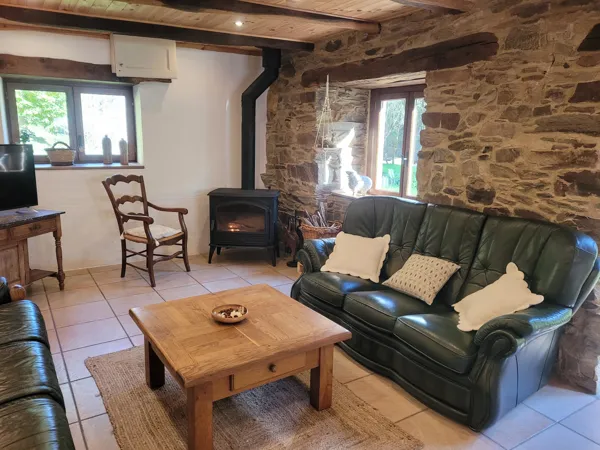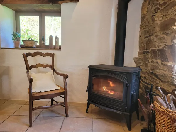Un salon/salle à manger avec un poêle à bois neuf (le bois est fourni durant votre séjour). Une TV de 108cm. Cuisine équipée. WIFI.