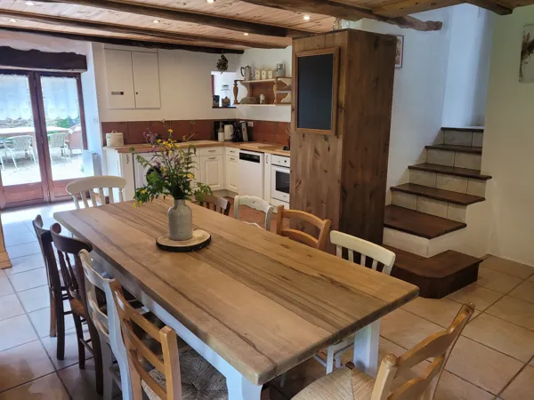 La maison que nous louons est une ancienne bâtisse restaurée, avec murs en pierre, poutres apparentes, parquets et avec tout le confort moderne.